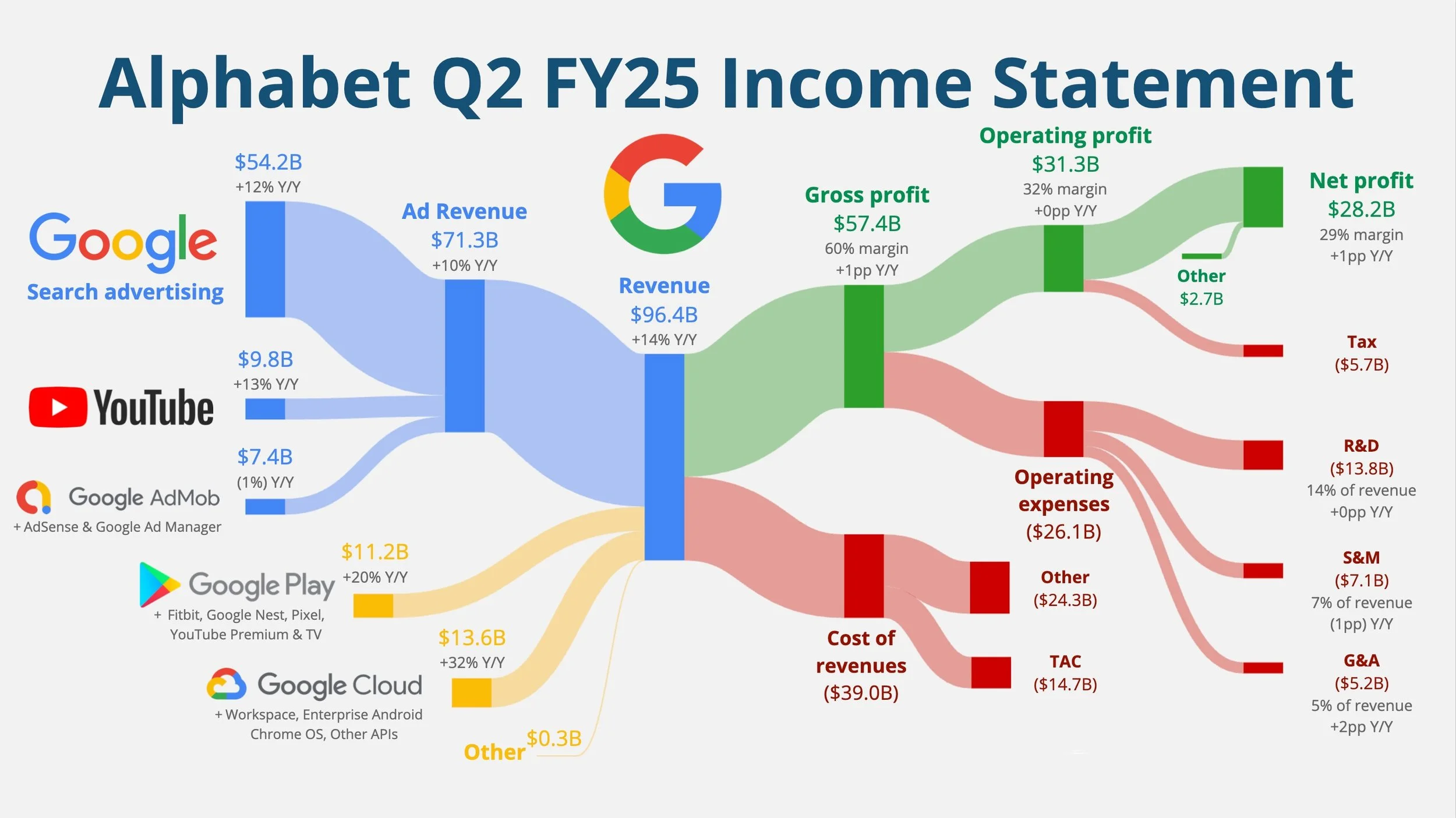 • Dessutom har prenumerationsintäkterna blivit en allt viktigare del genom segmentet Google Play, Fitbit, Google Nest, Pixel, YouTube Premium & TV (samlat under "Google Subscriptions, Platforms, and Devices"), vilket visade en stark tillväxt på +20% Y/Y till $11.2 miljarder.